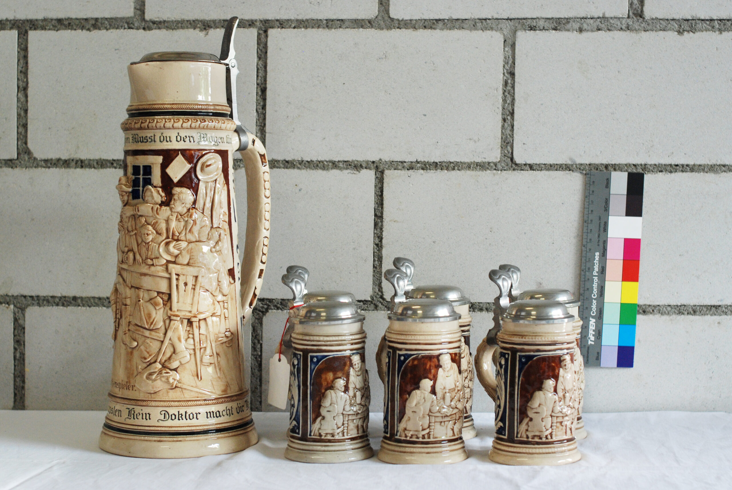Bierkrüge mit Eisendeckel, sieben Stück, Herkunft und Alter sind nicht bekannt