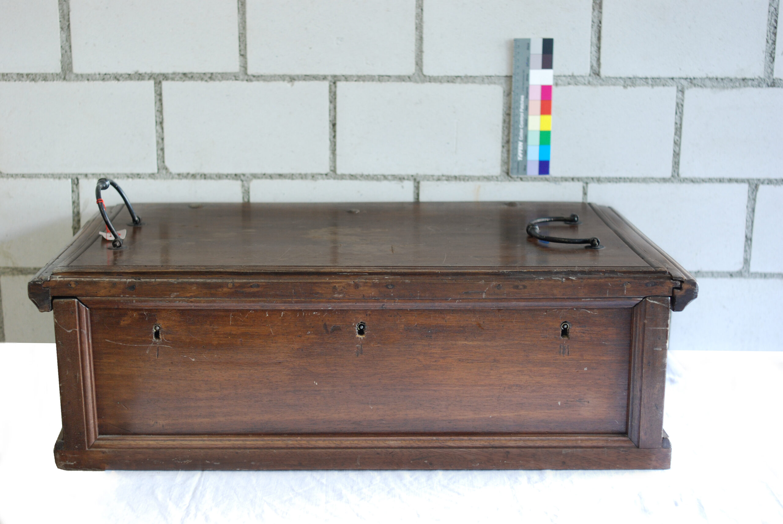 Truhe aus Holz, mit Eisenbeschlägen, Herkunft und Alter sind nicht bekannt